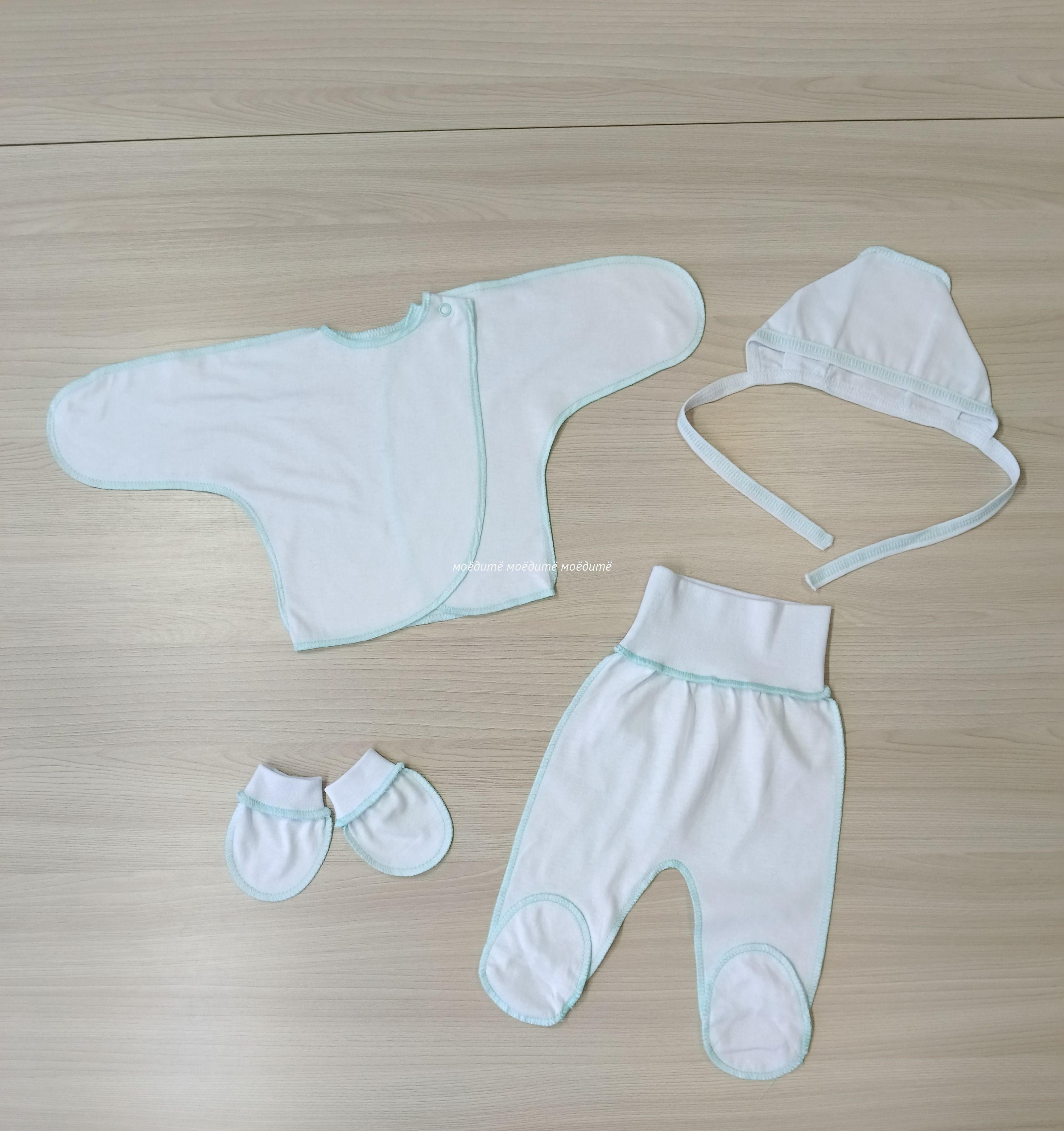 "МоёДитё" комплект на выписку из 4-х предметов белый + мята КП025 "Магнолия"